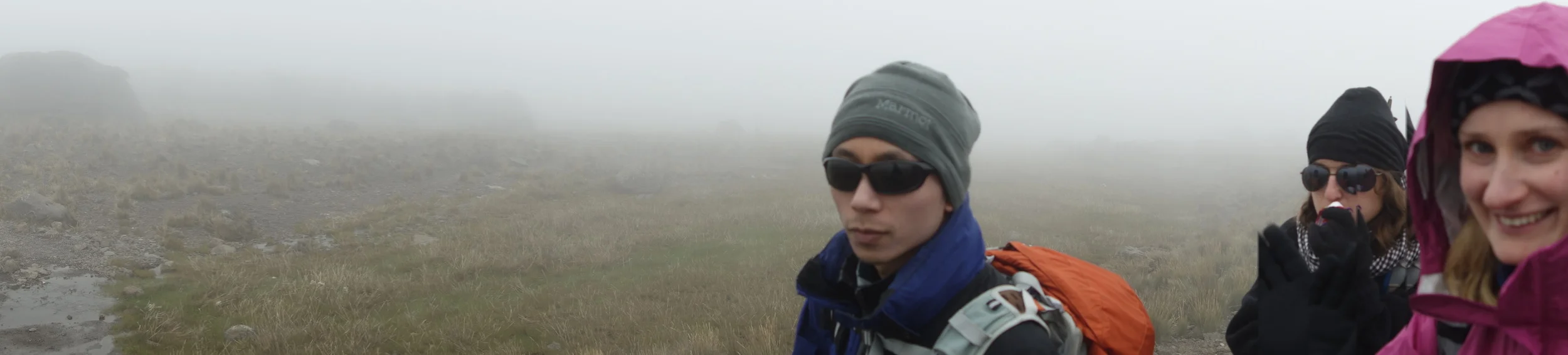 The terrain was undeniably boring. In the fog and at that altitude, there was no vegetation, no definition in the land, just a steady slope of dirt and scree as far as the eye could see. The wind blasted our faces; the rain seeped into my shoes, and the altitude change made it hard to walk. We were all visibly wearing down. I could tell we were getting to a critical mass.