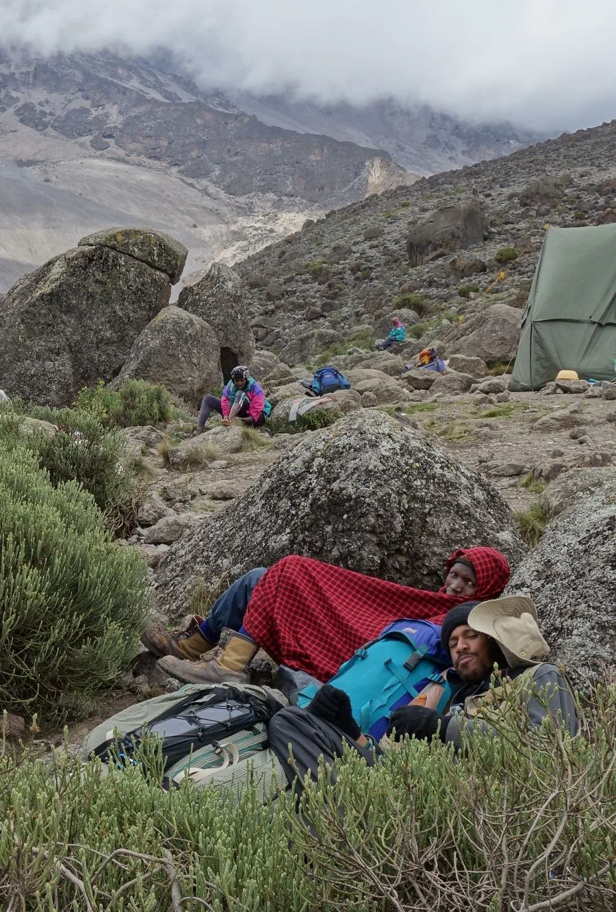 Meanwhile, the porters were breezing past us. I'd heard advice from other climbers: don't try to keep up with the porters. I figured we wouldn't see them at all, but they weren't single-minded. I got a laugh watching them take their smoke breaks along the trail. The atmosphere between climbers and crew was really good. The porters and guides would whisper pole pole to you as you passed, a Swahili phrase kind of like slowly, take it easy. It's the motto on the mountain, but regardless, it creates a good vibe, like we are all looking out for each other. Maybe it's just me, and it probably is, but having complete strangers say, be careful, go slow now, made me think, hey, thanks for caring.